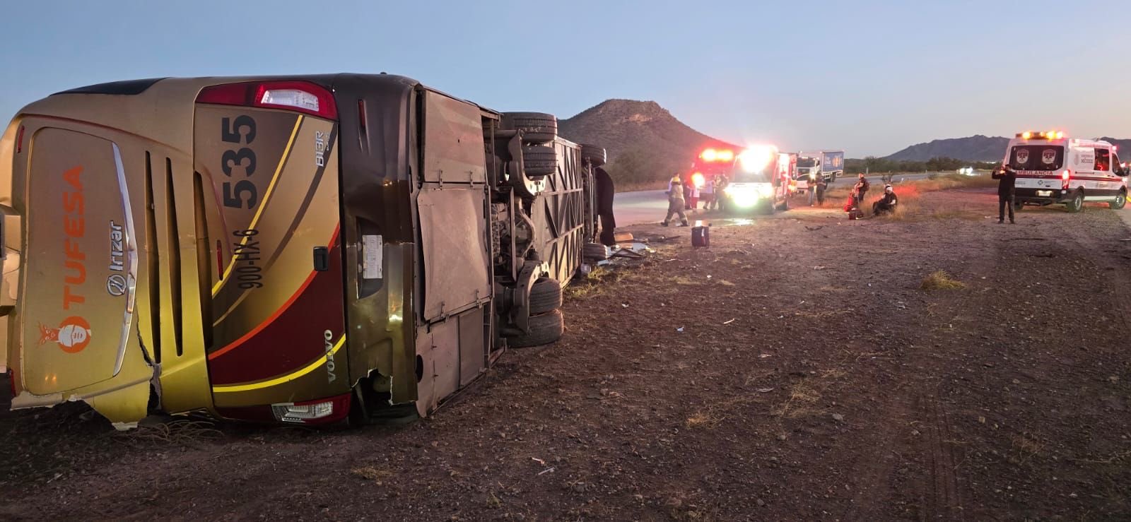Un autobús de la línea Tufesa volcó durante la madrugada de este viernes en el kilómetro 234 de la carretera Internacional México 15, en el tramo Guaymas–Hermosillo, dejando un saldo preliminar de 7 personas fallecidas y 25 lesionadas.