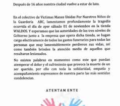 Hermosillo, Sonora.- El Colectivo de Víctimas Manos Unidas por Nuestros Niños de la Guardería ABC se solidarizó con los familiares de las víctimas mortales y lesionadas del incendio ocurrido en la tienda comercial Waldos el pasado sábado 1 de noviembre.