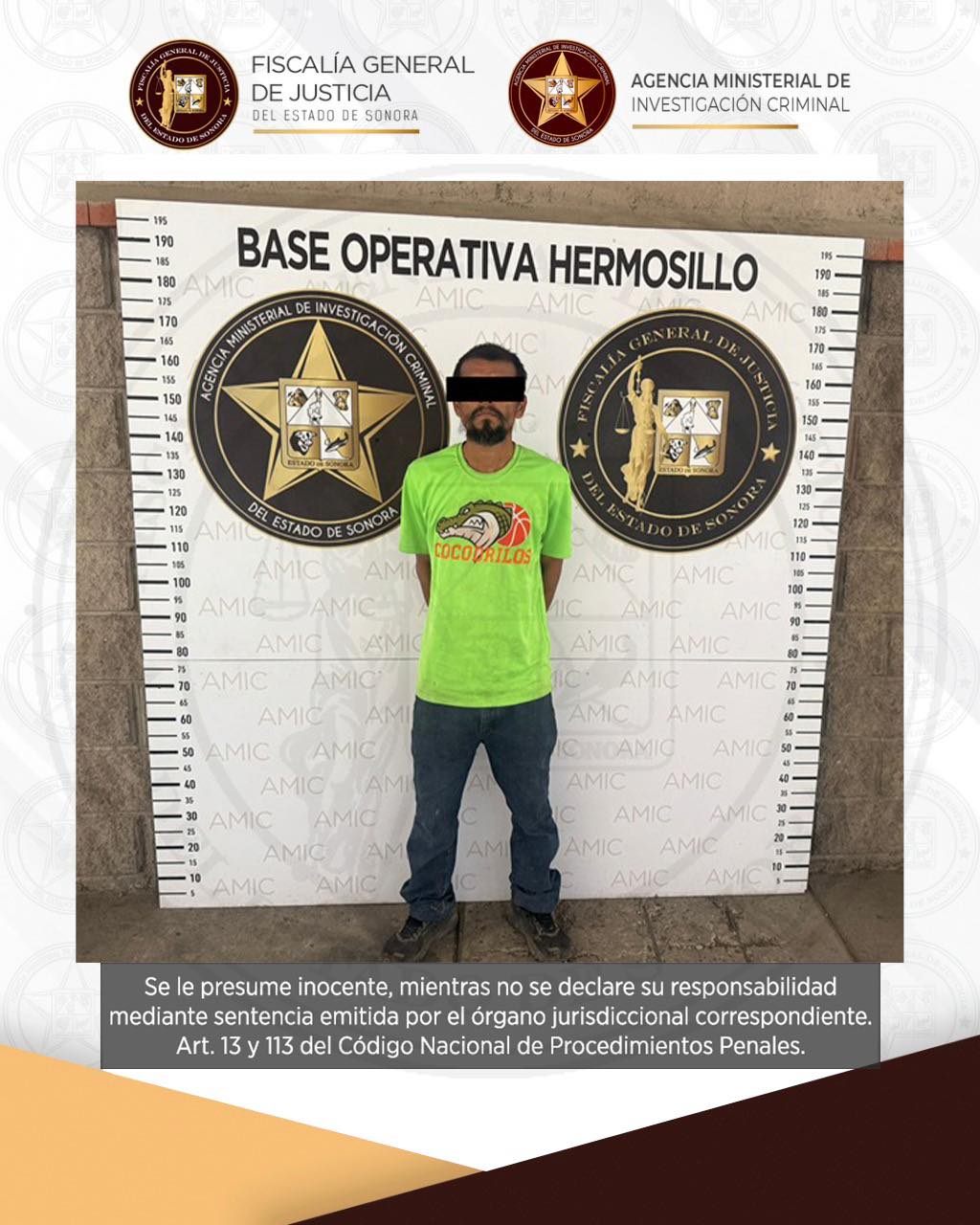 - La Fiscalía General de Justicia del Estado de Sonora (FGJES) informa que se logró la detención de Abel Ulises “N”, de 38 años, quien contaba con una orden de aprehensión por el delito de homicidio calificado con ventaja en grado de tentativa, en perjuicio de Kevin Alberto “N”, de 26 años; la captura se efectuó en la calle Salamanca y Periférico Oriente, en la colonia Metalera de Hermosillo.