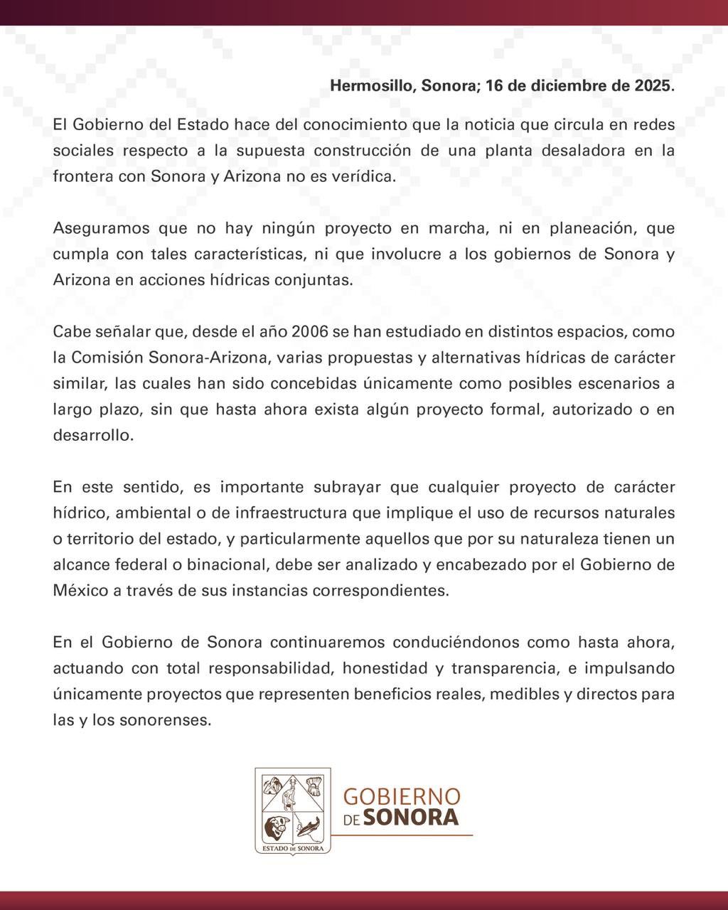 Esto luego de que el consorcio Acciona-Fengate presentara una propuesta técnica ante la Autoridad de Financiamiento de Infraestructura Hídrica de Arizona (WIFA) para construir una planta desaladora en Bahía Adair, una zona prioritaria de conservación de humedales en la costa sonorense.