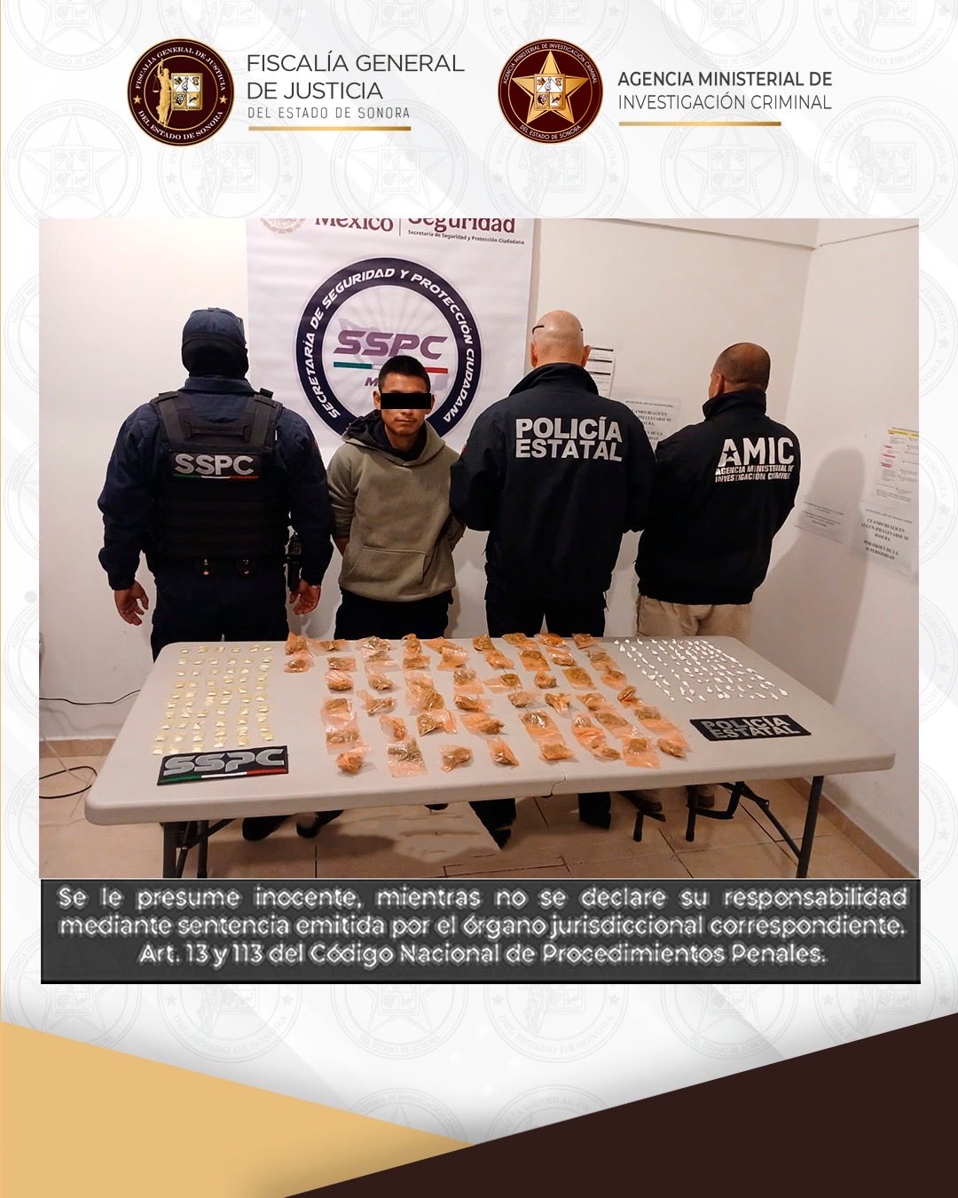 Nogales, Sonora, 26 de enero de 2026.- La Fiscalía General de Justicia del Estado de Sonora (FGJES) informa que, derivado de un operativo interinstitucional entre la Agencia Ministerial de Investigación Criminal (AMIC), la Secretaría de Seguridad Pública Ciudadana (SSPC) y la Policía Estatal de Seguridad Pública (PESP), fue detenido un masculino identificado como Marco Antonio “N”, de 28 años de edad, a quien se le aseguraron más de 200 dosis de droga, en el municipio de Nogales.