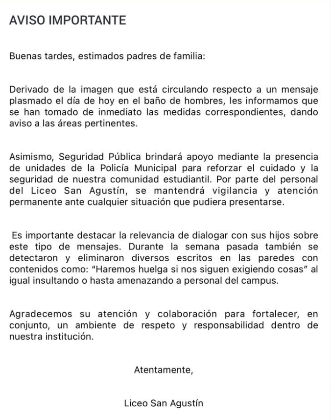Eso sí, y esto es MUY importante: Liceo San Agustín hizo un llamado a los padres a hablar con sus hijos sobre este tipo de mensajes.