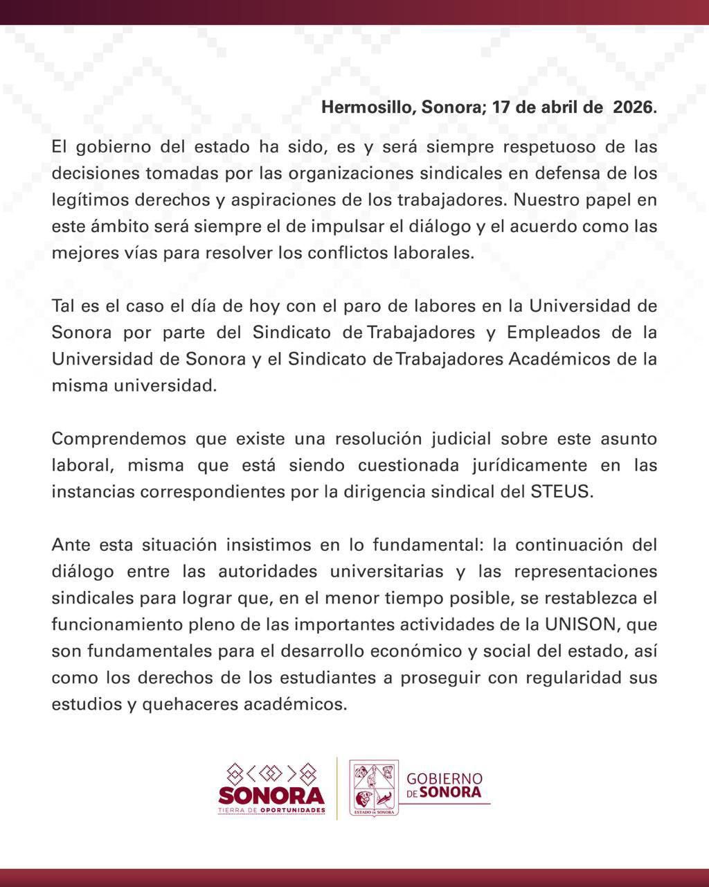 Ante esta situación insistimos en lo fundamental: la continuación del diálogo entre las autoridades universitarias y las representaciones sindicales para lograr que, en el menor tiempo posible, se restablezca el funcionamiento pleno de las importantes actividades de la UNISON, que son fundamentales para el desarrollo económico y social del estado, así como los derechos de los estudiantes a proseguir con regularidad sus estudios y quehaceres académicos.