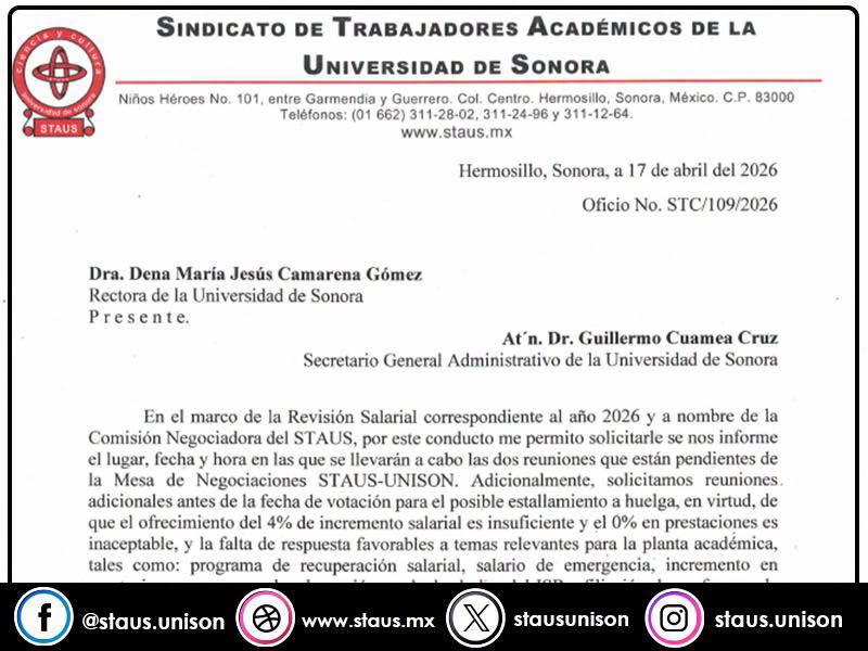 El STAUS ha solicitado formalmente a la administración de la Dra. Dena Camarena definir a la brevedad lugar y hora para continuar con las mesas de negociación de la Revisión Salarial 2026.