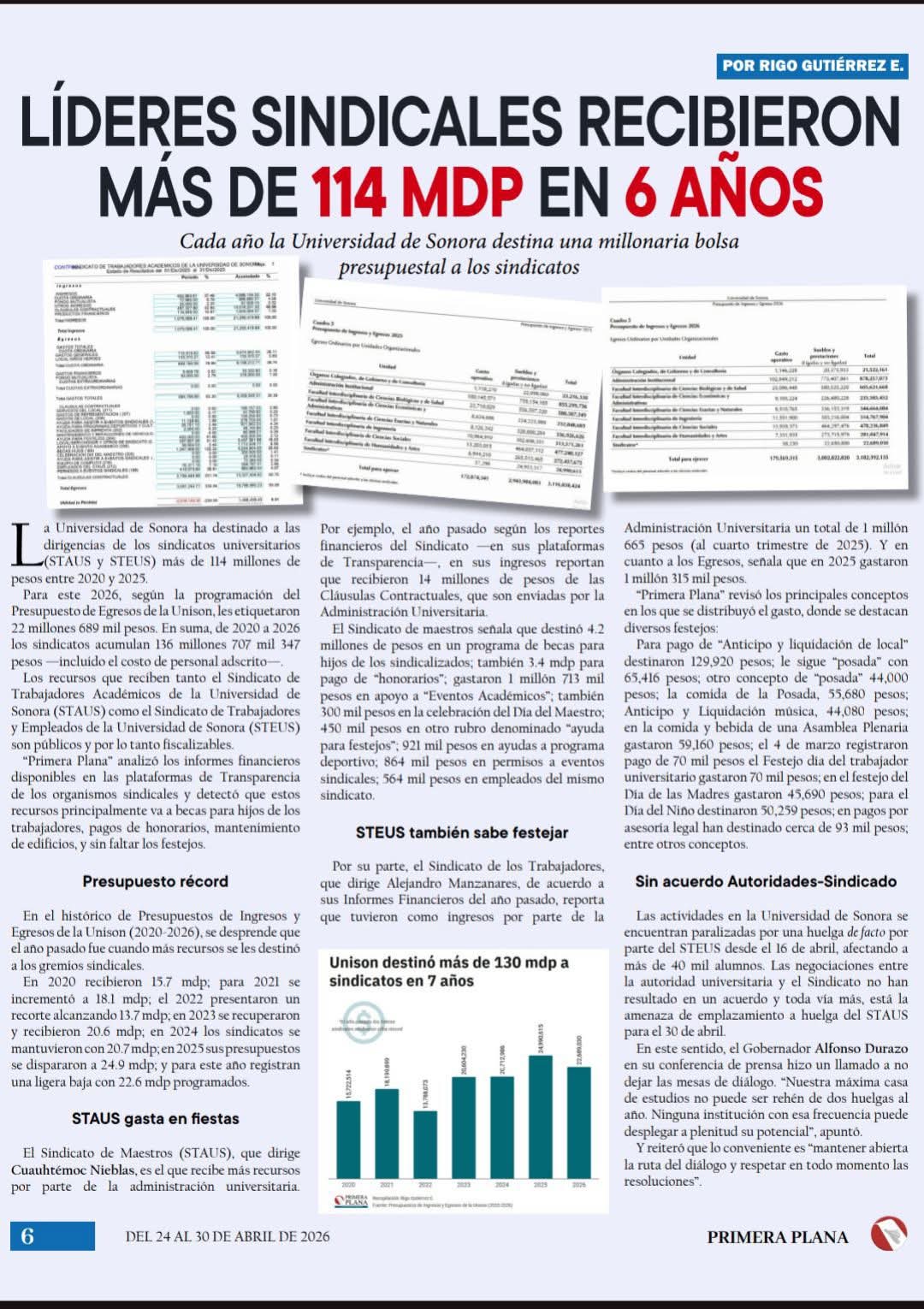 HERMOSILLO, SONORA — Mientras la Universidad de Sonora (Unison) enfrenta una parálisis que afecta a más de 40 mil estudiantes, las cifras oficiales revelan un flujo millonario hacia sus gremios. Entre 2020 y 2025, la institución ha transferido más de 114 millones de pesos a las dirigencias del STAUS y STEUS, recursos públicos que son manejados de forma discrecional por los propios líderes sindicales.