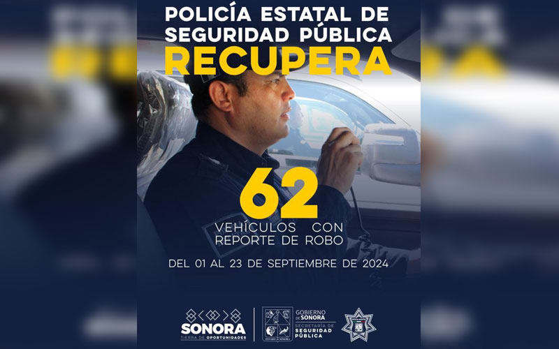 La Secretaría de Seguridad Pública (SSP) en Sonora, a través de la Policía Estatal de Seguridad Pública, recuperó durante septiembre 62 vehículos con reporte de robo, en atención a las denuncias ciudadanas.