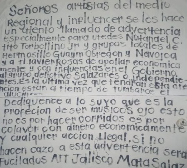 “Señores artistas del medio regional y influencer, se les hace un atento llamado de advertencia especialmente para ustedes Natanael C., Tito torbellino Jr y grupos locales de Hermosillo, Guaymas, Obregón y Navojoa y a ti Javier Rosas de apoyar económicamente y con influencias en el gobierno al grupo delictivo Salazares o independientes”, indica el mensaje firmado como Jalisco Matasalas.