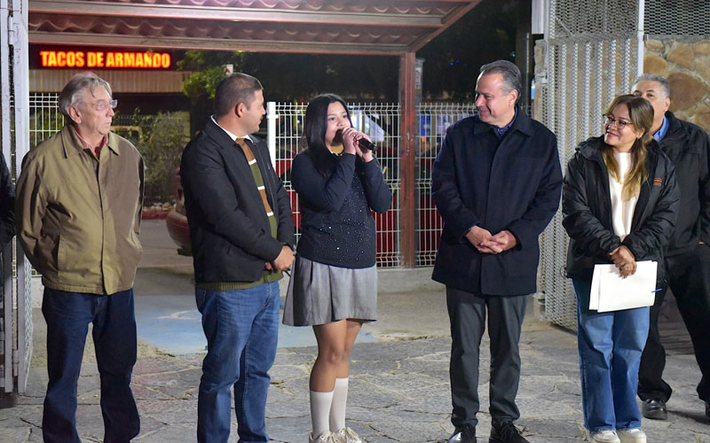 El presidente municipal y la comunidad educativa del turno vespertino inauguraron el tramo de 250 metros de iluminación que les permitirá transitar con seguridad al salir de la emblemática escuela “Prof. Carlos Espinoza Muñoz” conocida como “La Prevo”.