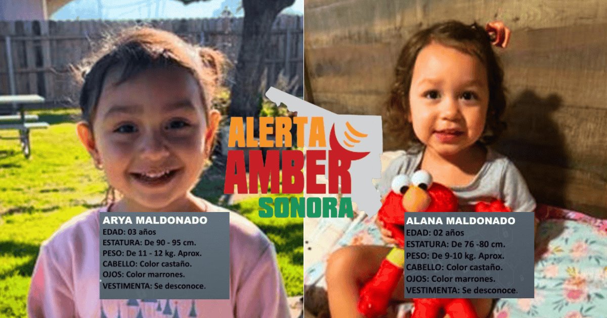 La Fiscalía General de Justicia del Estado de Sonora (FGJE) emitió una Alerta Amber Sonora para colaborar con las autoridades de California, Estados Unidos, en la búsqueda de Arya Maldonado, de 3 años, y su hermana Alana Maldonado, de 2 años, quienes fueron sustraídas sin autorización legal en Hanford, California.