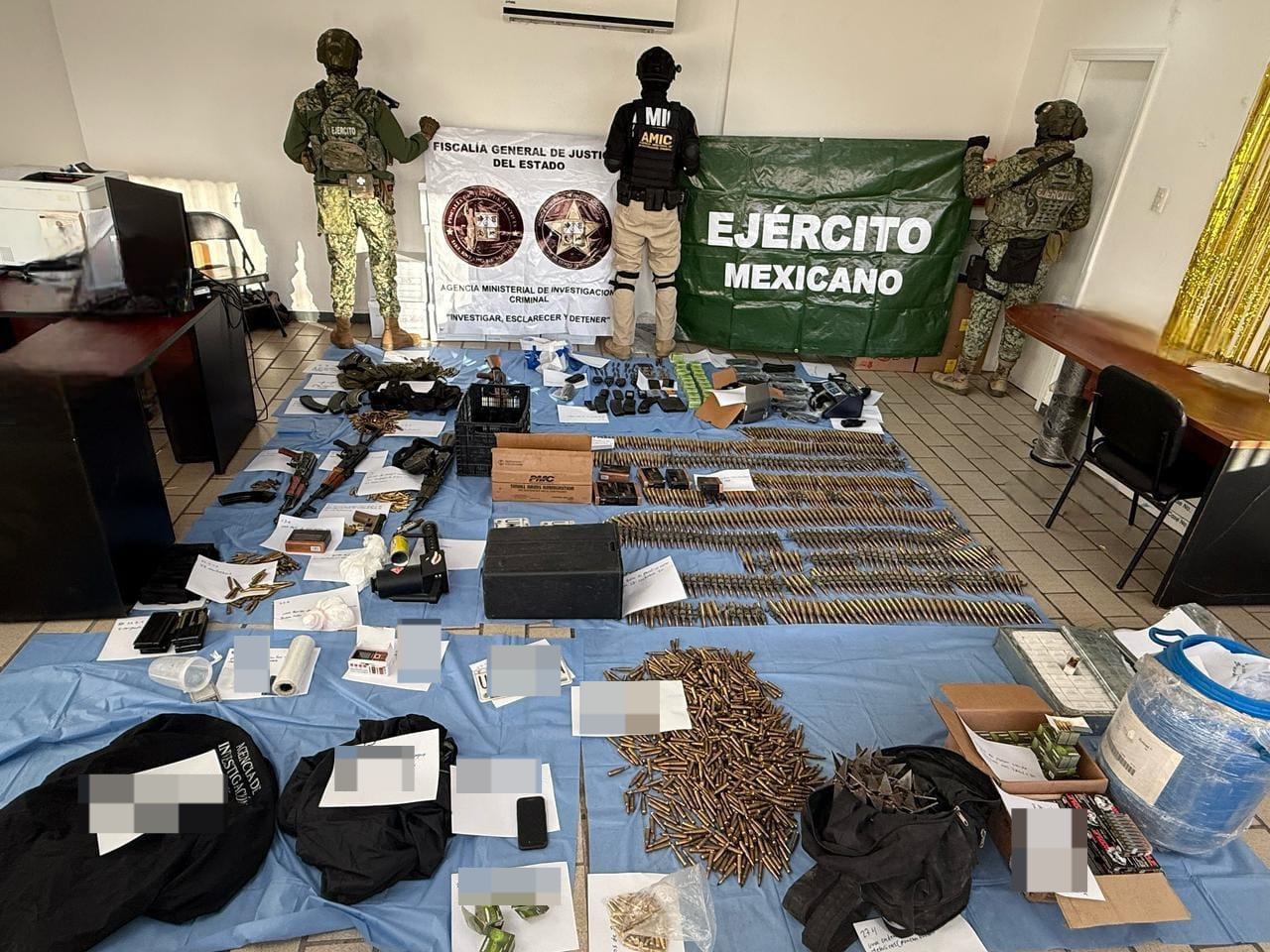 Entre los objetos asegurados están cuatro fusiles de asalto AK-47, una pistola calibre 9 milímetros, 34 cargadores AK-47, 4 mil 57cartuchos útiles de los calibres 7.62x39, .50, .223 y 7.62x51, además de cartuchos diversos con leyendas especiales y de colores.