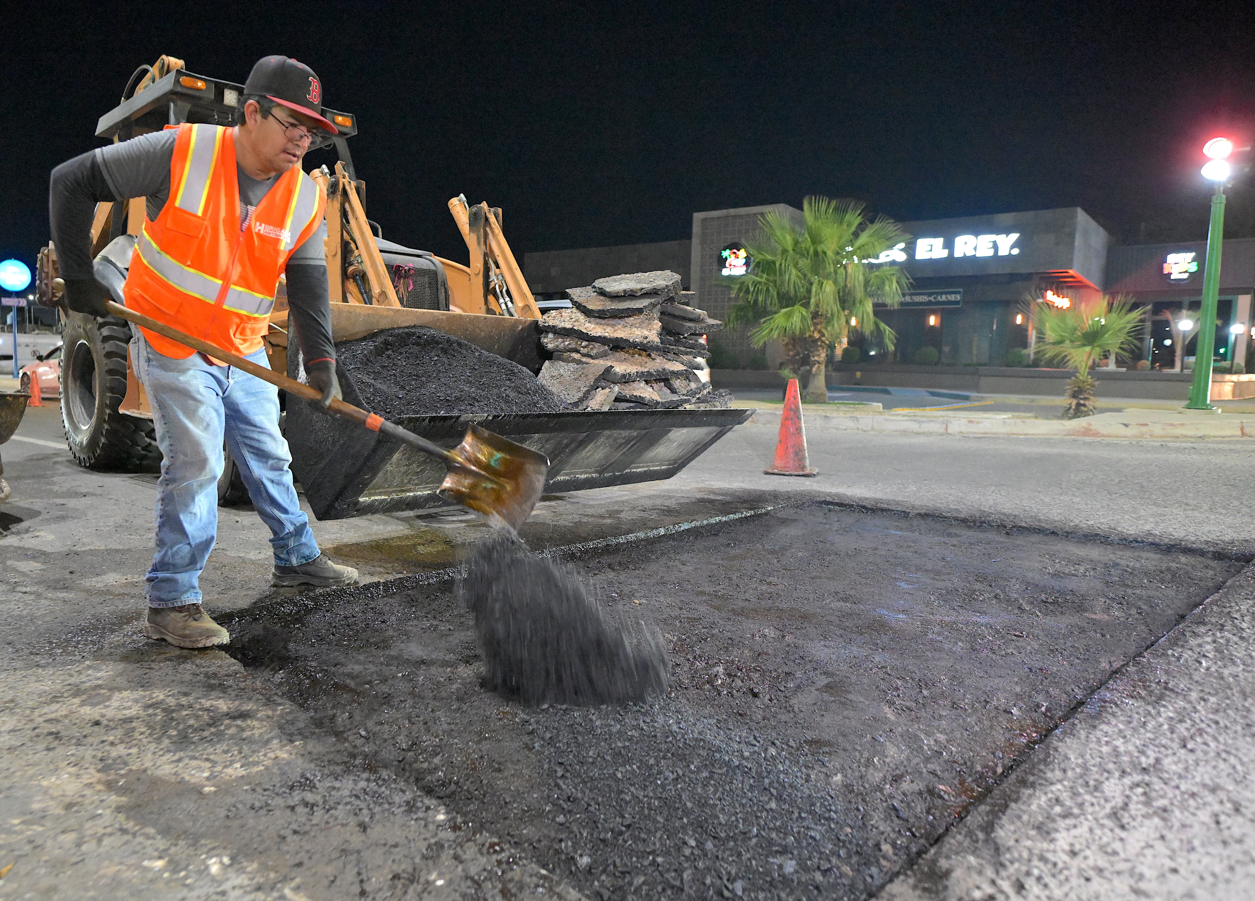 Hermosillo, Sonora; 5 de septiembre, 2025.- El Presidente Municipal de Hermosillo, Antonio Astiazarán Gutiérrez, atestiguó acciones de bacheo en jornada nocturna en el bulevar López Portillo, trabajos que forman parte del programa diario de mantenimiento en vialidades principales y accesos a colonias con 15 cuadrillas diurnas y 4 nocturnas.