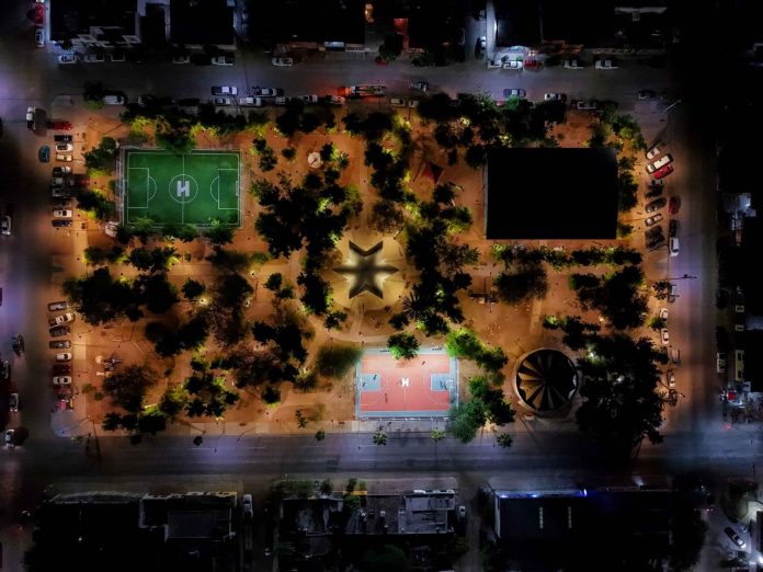 El domo central del Parque Copacabana fue rehabilitado e iluminado como parte de la modernización del espacio público en la colonia Olivares.