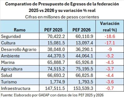 Eche un vistazo al cuadro comparativo que mostramos para que se den cuenta lo que aprobó ese diputado y el oficialismo y que según él es una chingonería, pero en realidad hay una sustancial reducción de recursos en términos reales respecto a 2025 y así, en Seguridad -18.6 por ciento; cultura -17.1 por ciento; desarrollo agrario -9 por ciento, y entre -3 y el -6 por ciento de reducciones respecto a 2025 en agricultura, turismo, medio ambiente, infraestructura, marina e incluso el sector salud.