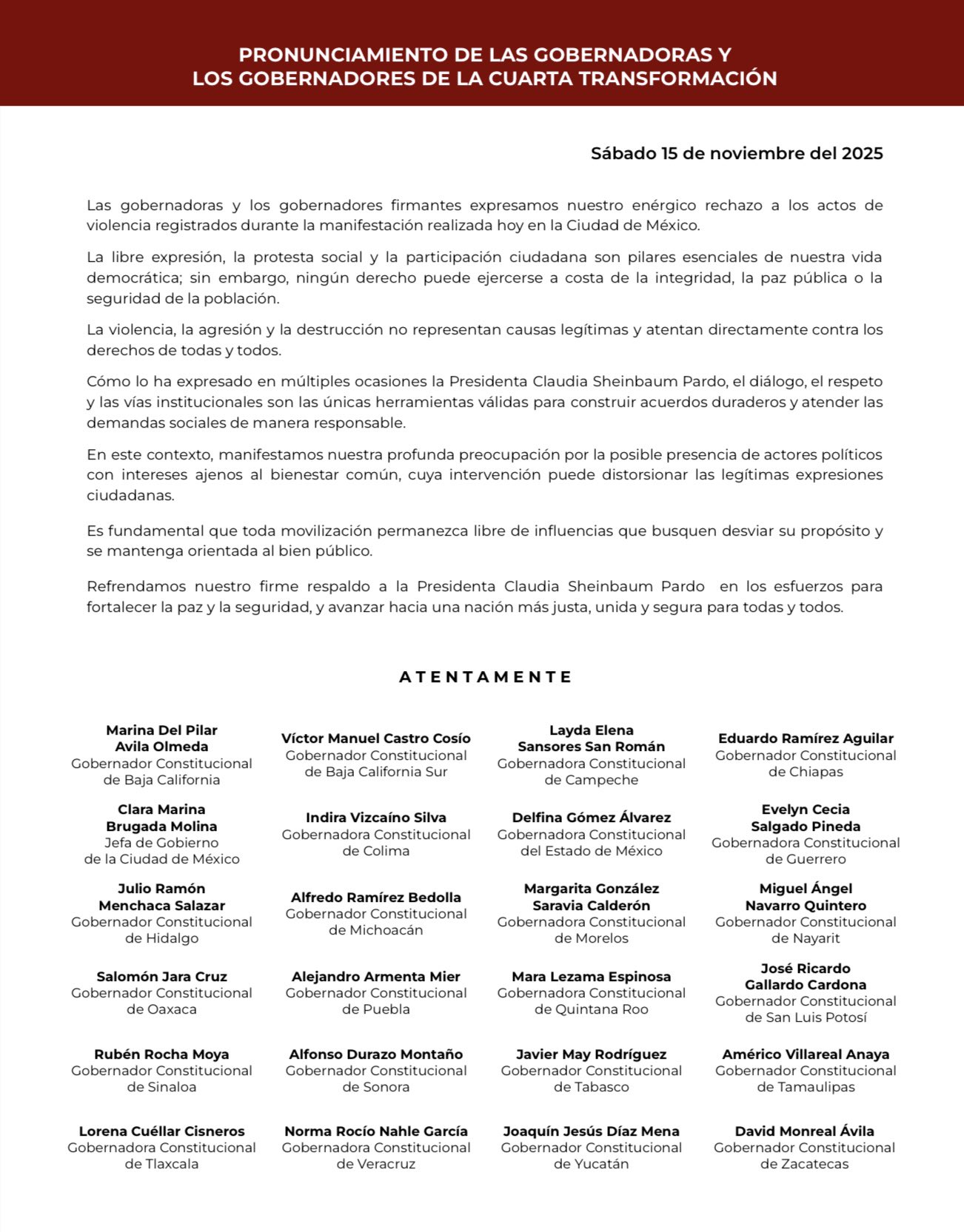 Presidenta, cuenta y contará siempre con mi respaldo para seguir transformando nuestro país y para continuar construyendo un estado en el que todas las personas puedan desarrollarse en libertad, armonía y con plenas oportunidades.