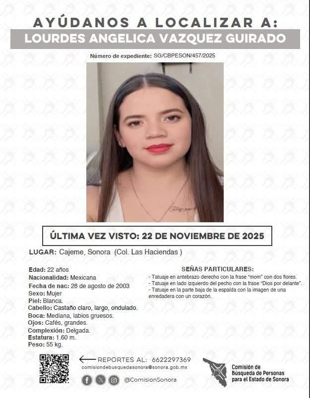 Este lunes, autoridades confirmaron el hallazgo sin vida de Lourdes Angélica Vázquez Guirado, de 22 años, quien había sido reportada como desaparecida desde el sábado en Ciudad Obregón. La joven fue localizada dentro de un domicilio de la colonia Las Haciendas. Según los primeros informes, el cuerpo se encontraba debajo de una cama y envuelto en una sábana, por lo que se inició de inmediato el protocolo correspondiente para preservar la escena y dar paso a las investigaciones. El inmueble está ubicado sobre la calle Guerrero, entre Laguna y Franciscanos, zona donde Lourdes presuntamente residía. Elementos de seguridad mantienen resguardo mientras personal pericial realiza el levantamiento y traslada el cuerpo al Servicio Médico Forense. Las autoridades continúan recabando información para esclarecer qué ocurrió. Hasta el momento no se han dado a conocer más detalles.