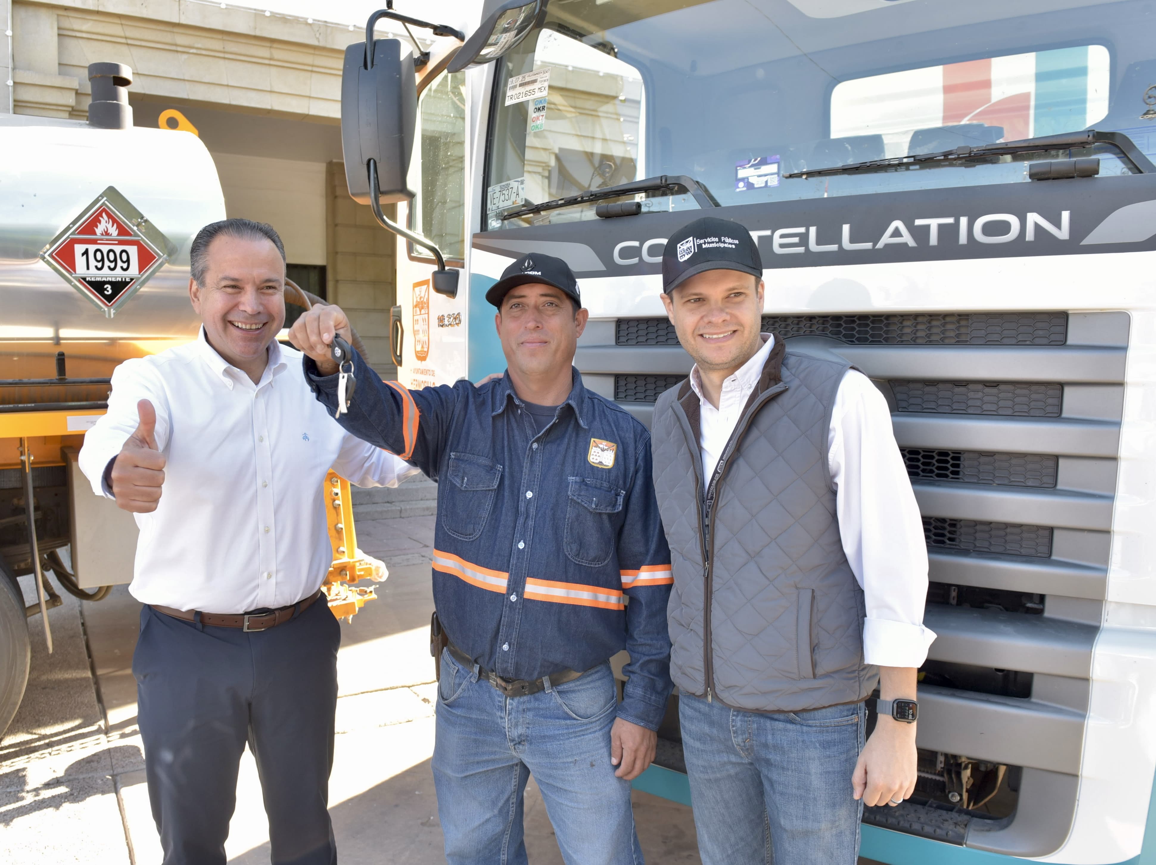 Las acciones de mantenimiento a vialidades y limpieza que diariamente realiza el Ayuntamiento de Hermosillo se verán reforzadas, destacó Antonio Astiazarán al entregar dos camiones de volteo y una petrolizadora que no solamente fortalece la labor operativa de dichas áreas sino las dignifica.