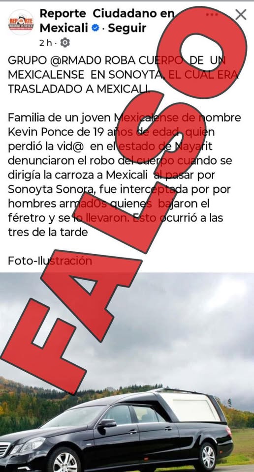 En relación a la información que propala una cuenta creadora de contenido de la red social Facebook, en donde señala el supuesto robo de un cuerpo en Sonoyta durante su traslado a Mexicali, se informa que el contenido es FALSO, no existe denuncia ni dato oficial que corrobore tal información, debido a lo anterior, se recomienda a la población no interactuar con este tipo de cuentas e informarse únicamente con medios de comunicación establecidos o vías oficiales.
