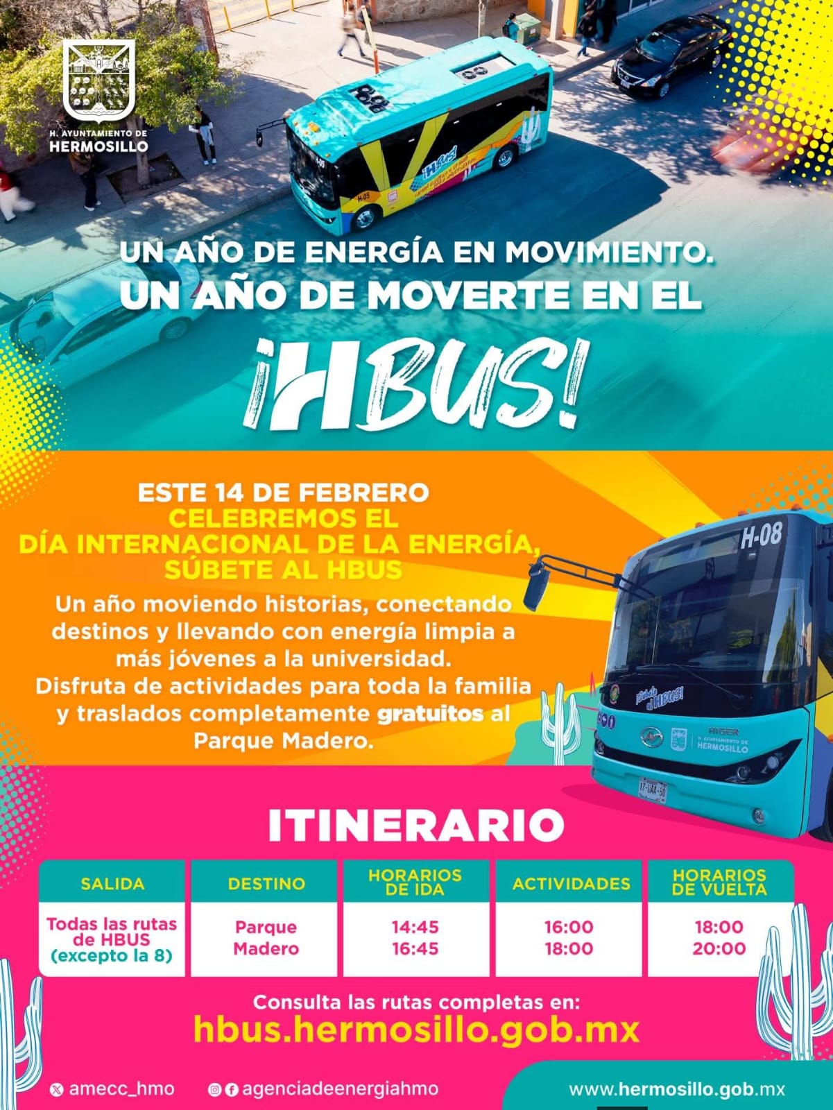 Hermosillo, Sonora; 11 de febrero, 2026.- Como parte de la celebración del Día Internacional de la Energía, y el primer año de operaciones del sistema de electromovilidad para estudiantes universitarios H Bus, el Ayuntamiento de Hermosillo ofrecerá a usuarios del programa y sus familias traslados recreativos gratuitos al Parque Madero.