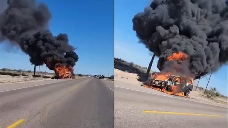 Una camioneta se incendió y posteriormente explotó en el kilómetro 90 de la carretera 100 Hermosillo-Bahía de Kino.
