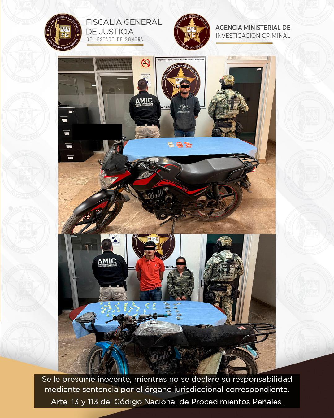 Bácum, Sonora, 27 de febrero de 2026.- En acciones estratégicas realizadas en el municipio de Bácum, elementos de la Agencia Ministerial de Investigación Criminal (AMIC), en coordinación con la Secretaría de la Defensa Nacional (DEFENSA), ejecutaron operativos que derivaron en la detención de tres personas y el aseguramiento de diversas dosis de narcótico, dinero en efectivo y motocicletas.