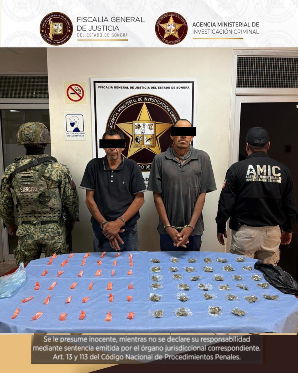 Cajeme, Sonora, 1 de marzo de 2026.- La Fiscalía General de Justicia del Estado de Sonora (FGJES), a través de la Agencia Ministerial de Investigación Criminal (AMIC), en coordinación con la Secretaría de la Defensa Nacional (DEFENSA), logró la detención en flagrancia de dos personas por su probable responsabilidad en el delito contra la salud, en hechos registrados en Cajeme.