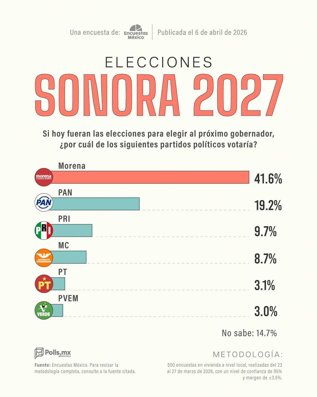 l panorama electoral en Sonora comienza a tomar forma rumbo a 2027, y las primeras mediciones colocan a Morena como el claro favorito. De acuerdo con datos recientes de intención de voto, el partido guinda no solo lidera, sino que duplica a su principal competidor, el PAN, lo que marca una tendencia relevante en el estado.
