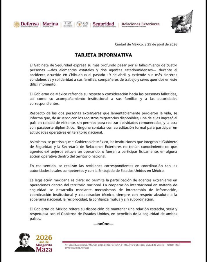 Ciudad de México, 25 de abril de 2026.- El Gabinete de Seguridad expresa su más profundo pesar por el fallecimiento de cuatro personas —dos elementos estatales y dos agentes estadounidenses— durante el accidente ocurrido en Chihuahua el pasado 19 de abril, y extiende sus más sinceras condolencias y solidaridad a sus familias, compañeros de trabajo y seres queridos en este difícil momento.