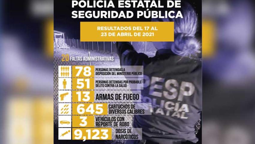 Durante este periodo fueron detenidas 78 personas, 51 de las cuales fueron por el probable delito contra la salud, además, se les incautó lo equivalente a más de 9 mil 123 dosis de sustancias similar al narcótico.