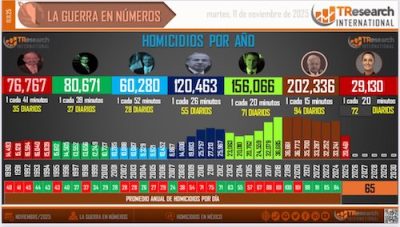Cómo con Calderón los homicidios aumentaron 148 por ciento, con Peña 42 por ciento, con López se redujeron 9 por ciento y entre octubre de 2024 a octubre de 2025 se redujeron el 37 por ciento, si de acuerdo con cifras oficiales durante el calderonato se registraron 120 mil 463 homicidios dolosos, durante el peñato fueron 156 mil y en el obradorato fueron asesinadas 202 mil 336 personas.